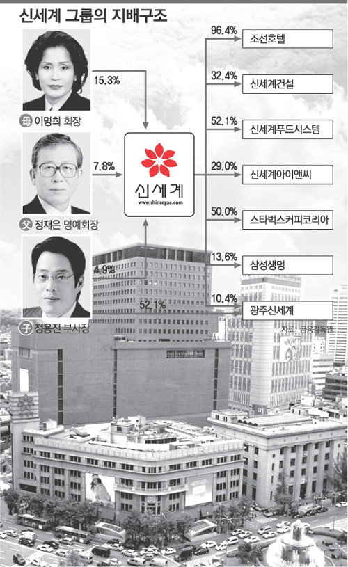 ‘법대로 승계’를 선언함에 따라 신세계 이명희(李明熙) 회장과 이 회장의 남편인 정재은(鄭在恩) 명예회장 지분의 조기 증여를 통해 장남인 정용진(鄭溶鎭) 부사장에게 힘을 실어주는 경영권 승계 작업은 가속도가 붙을 것으로 보인다.
