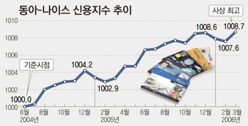 동아-나이스 신용지수는 한국신용정보에 등록된 3367만9786명의 신용점수를 모두 취합해 평균을 낸 후 기준 시점인 2004년 6월을 1000.0으로 놓고 분석 대상 시점의 상대적인 점수를 계산한 것이다.