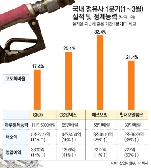 고유가시대에 국내 정유사들은 얼마나 돈을 벌었을까. SK㈜ GS칼텍스 에쓰오일 현대오일뱅크 등 국내 4대 정유사들의 1분기(1∼3월) 실적을 분석해 봤다.