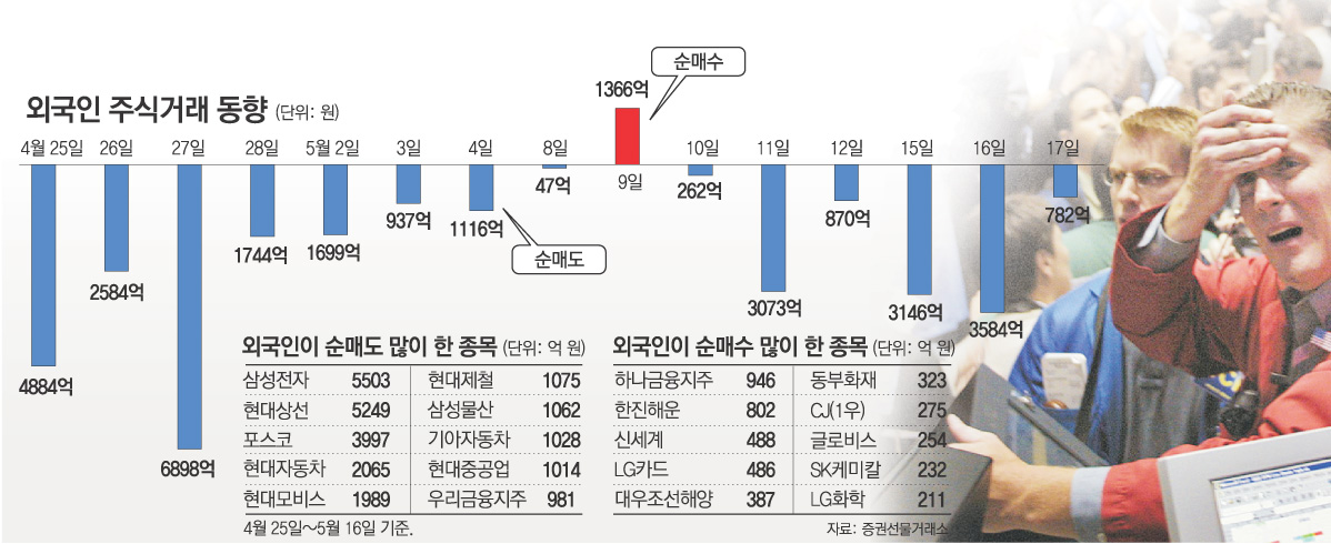 외국인들은 지난달 25일 이후 14일(거래일 기준) 동안 3조 원어치가량의 주식을 순매도했다.
