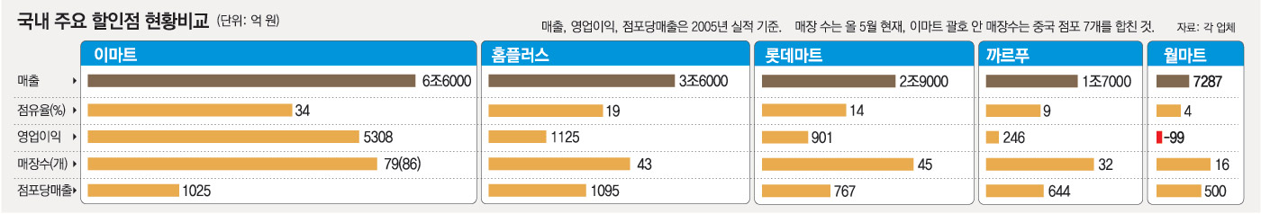 월마트는 세계 1위 유통업체지만 국내에서는 줄곧 5위(시장점유율 4% 안팎)에 그치는 부진한 성적표를 남겼다. 지난해엔 매출액 7287억 원에 99억 원의 적자를 냈다.