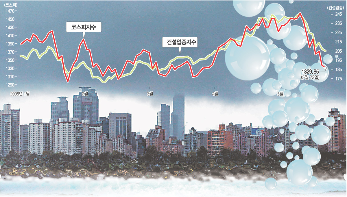 12일 18%에 이르던 거래소시장의 건설업종 지수 상승률(연초 대비)은 23일 2%대로 낮아졌다. 실적 개선 전망에 따라 상승세가 두드러지며 올해 증시를 이끌던 건설주 주가가 거의 연초 수준으로 되돌아간 셈이다.