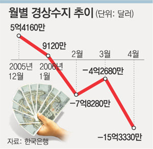 2월부터 석 달 연속 적자를 내면서 올해 경상수지 누적 적자는 26억5000만 달러에 이르렀다. 3개월 연속 적자도 외환위기 직전인 1997년 8∼10월 이후 처음이다. 지난달 대규모 경상수지 적자는 상품수지 흑자 폭이 줄어든 데다 대외 배당금 지급이 집중되면서 소득수지가 악화됐기 때문. 해외여행 등으로 빠져나간 돈도 많았다.