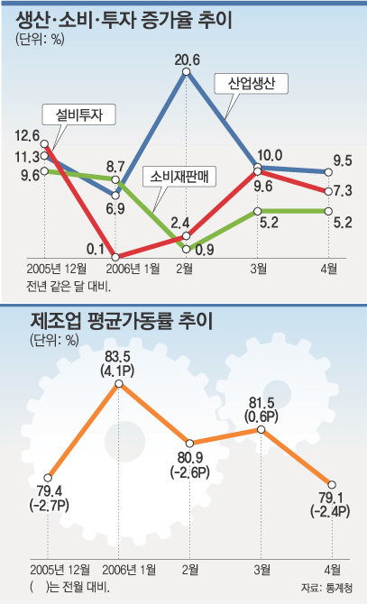 통계청의 ‘4월 산업 활동 동향’을 보면 경기가 연내 정점에 도달한 뒤 하락세로 돌아설 수 있다는 우려가 나온다.