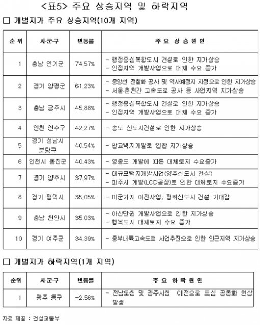 송도신도시 건설에 힘입어 인천 연수구는 42.27%가 뛰었고, 판교신도시, 영종도 개발, 미군기지 이전 및 평화도시 건설 등이 작용한 성남 분당, 인천 옹진, 경기 평택 등도 나란히 40.54%, 40.43%, 35.05%의 높은 상승률을 기록했다.