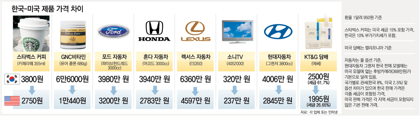 미국 자동차 가격 정보 사이트인 ‘켈리 블루 북’에 따르면 일본 도요타자동차의 렉서스 ES350의 미국 판매가(풀 옵션 기준, 지역별 세금 부과 전 가격)는 4597만 원(4만8390달러)이지만 한국에서는 6360만 원(부가가치세 및 특별소비세 등 포함)에 팔린다. 관세(2.5%)를 뺀 미국 판매가를 달러당 950원으로 환산하면 약 4485만 원. 한국에서 관세(8%) 및 각종 세금을 제외한 가격인 4738만 원과 비교해도 250만 원 이상 차이가 난다.