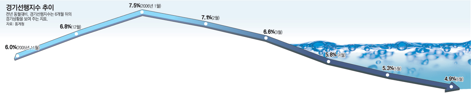 통계청이 28일 발표한 6월 산업활동 동향에 따르면 6개월가량 뒤의 경기를 예고하는 지표인 경기선행지수(전년 동월 대비)는 4.9%로 전달보다 0.4%포인트 떨어졌다.
