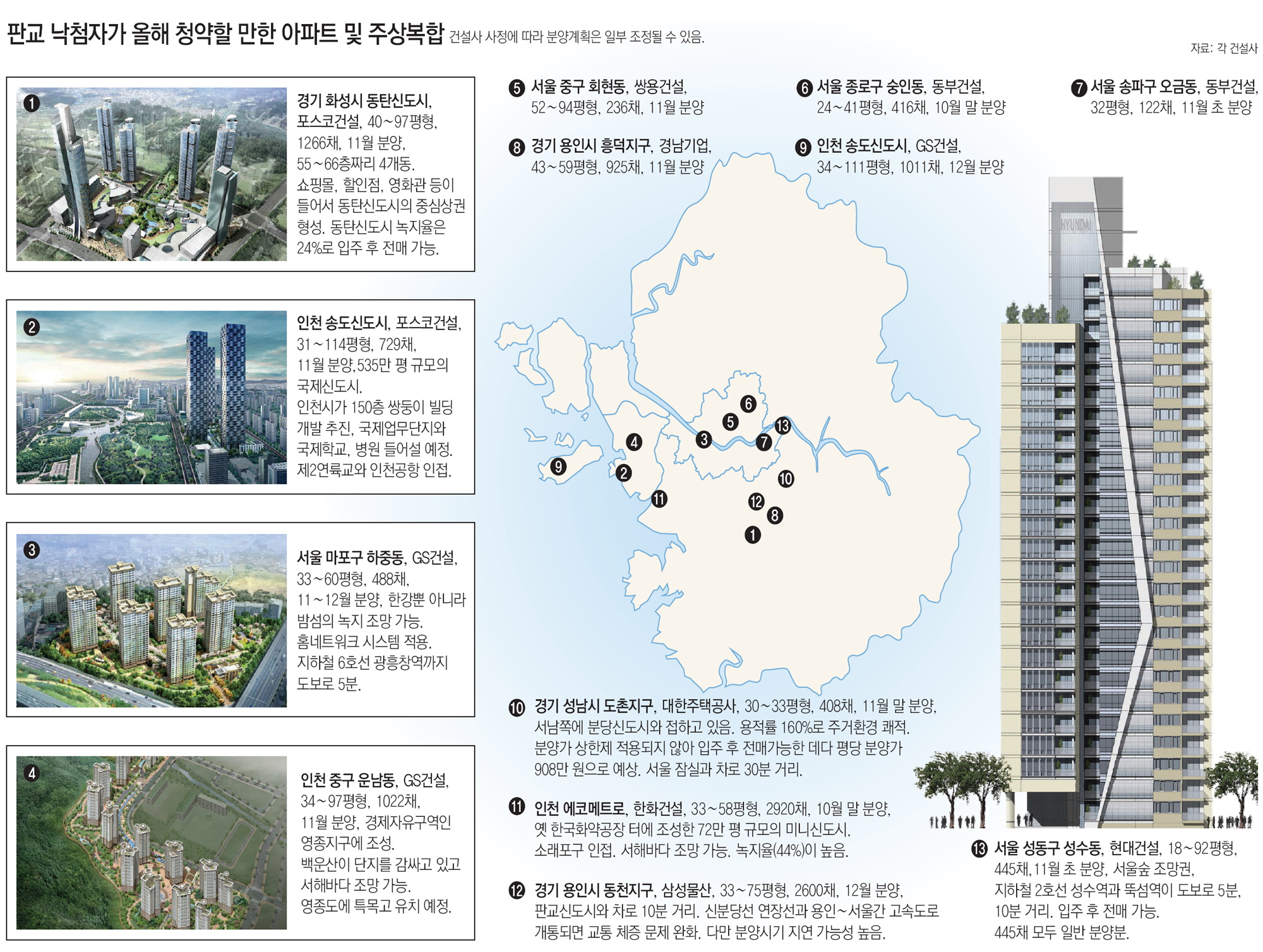 올해 말까지 판교 낙첨자들이 청약할 만한 서울, 경기, 인천 등 수도권 물량은 6만6000여 채. 서울 강남권부터 경기 용인시 일대 택지지구, 인천 송도국제신도시 등이 있다.