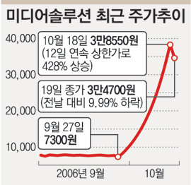 이 소식이 전해지면서 전날까지 12거래일 동안 상한가를 치며 428%나 올랐던 미디어솔루션 주가는 이날 9.99% 급락했다.