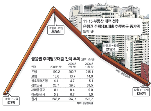 11·15 부동산 대책 이후 은행권의 주택담보대출 증가세는 둔화되고 있는 것으로 나타났다. 이달 1∼13일 은행권의 하루평균 주택담보대출 증가액은 1240억 원으로 11월 8∼20일의 하루평균 증가액(3529억 원)의 3분의 1 수준으로 떨어졌다.