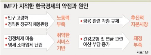 IMF는 서비스 산업의 경쟁력이 현저히 떨어지는 점도 문제점으로 지적했다.