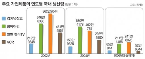 비디오카세트레코더(VCR)의 2006년 1∼9월 생산량 52만6844대는 2005년 같은 기간 생산량 116만1189대의 절반에도 못 미쳤다. 일반 컬러TV도 2002년 862만2044대가 국내에서 만들어졌으나 2005년 생산량은 395만1504대에 그쳤다.