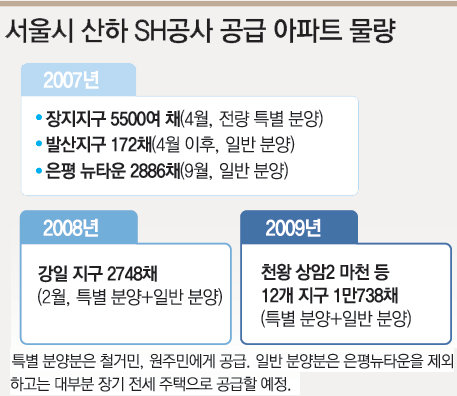 올해 발산지구 172채, 내년 강일지구 730채에 이어 2009년에는 12개 지구 1만738채가 장기 전세주택으로 공급된다. 전세금은 주변 전세금의 70∼80% 수준.
