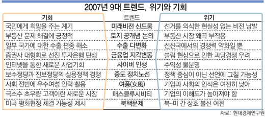 올해 여성의 사회진출이 확대돼 기업으로서는 우수인력을 공급받는 기회로 분석됐다. 여성 대선후보와 여성 대법관 등 성공 모델이 등장하고 있으며, 여성 경제활동 참가율도 2005년 50.1%에서 2006년 51.3%로 높아지고 있다. 현대연구원 측은 “보육시설을 선진화하고, 임신 등으로 경력이 단절된 여성에게 직장복귀 프로그램을 제공하는 등 사회 환경이 개선돼야 한다”고 지적했다.