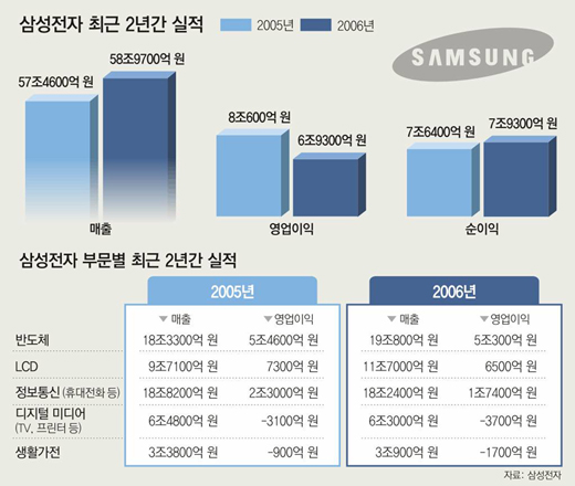 한편 삼성전자는 올해 마이크로소프트의 새 컴퓨터 운영체제인 윈도 비스타 출시 효과에 따른 D램 수요 증가, 휴대전화 1억3000만 대 판매, LCD TV 1100만 대와 플라스마디스플레이패널(PDP) TV 250만 대 이상 판매 등을 통해 지난해보다 8% 늘어난 63조6000억 원의 매출 실적을 달성할 것으로 전망했다.