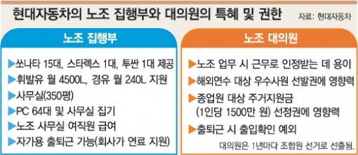 일 잘하는 근로자를 위한 인센티브제도인 우수종업원 해외 연수, 연리 2%인 주거지원금 지원 대상 등의 선정 권한도 사실상 대의원이 갖고 있다.