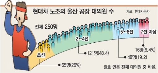 1991년 처음 노조 대의원에 선출된 P 씨는 지난해까지 7번 대의원에 당선됐다. 울산공장의 대의원 250명 가운데 P 씨처럼 7선 이상인 조합원은 16명. 250명 중 74%인 185명이 재선 이상의 대의원이다.