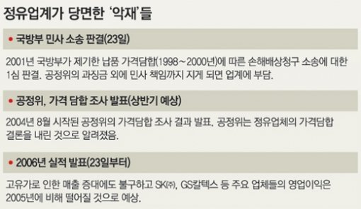 1998년부터 2000년까지 정유업계의 국방부 군납 유류품 가격담합에 대해 국방부가 제기한 손해배상청구 소송의 판결이 23일로 다가온 데다 공정거래위원회도 4년째 끌어온 정유업계의 가격담합 혐의조사에 대한 결과를 조만간 발표할 예정이기 때문이다.