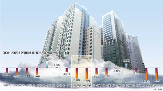 하지만 연령대별로는 30∼39세, 70∼74세를 뺀 나머지 전 구간에서 자가 비중이 떨어졌다. 이 가운데 70세 이후가 전체 가구에서 차지하는 비중은 9.1%에 그치는데다 주택시장에서 조만간 떨어져 나간다는 점을 감안하면 사실상 30대를 제외한 모든 유효수요 계층에서 자가 보유 비중이 하락한 것으로 해석된다.
