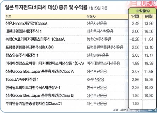 펀드평가사 제로인에 따르면 한국에서 설정된 펀드 중 일본에 일정 부분 투자하는 펀드 자금은 지난해 말 7조3186억 원에서 24일 현재 8조6292억 원으로 늘었다. 같은 기간에 펀드 수도 104개에서 118개로 증가했다.