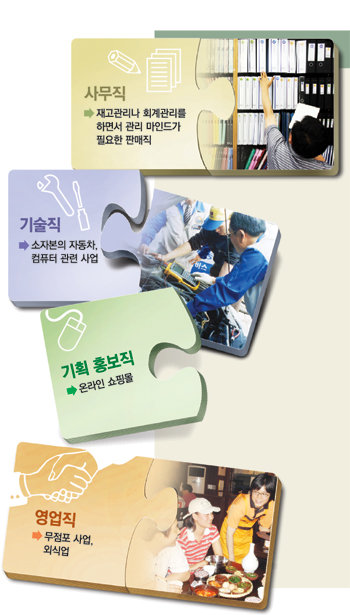 또 기술직 출신 퇴직자는 환경 관련업, 컴퓨터나 자동차 관련업, 수리점 등 재활용 사업이 좋다. 손재주가 있고 차별화된 기술을 살릴 수 있기 때문이다. 평소 사회 트렌드를 읽는 훈련을 해온 기획·홍보직종은 광고, 홍보 대행업이나 독특한 아이템의 온라인 쇼핑몰을 창업하면 성공 가능성이 높다고 강 대표는 조언했다.