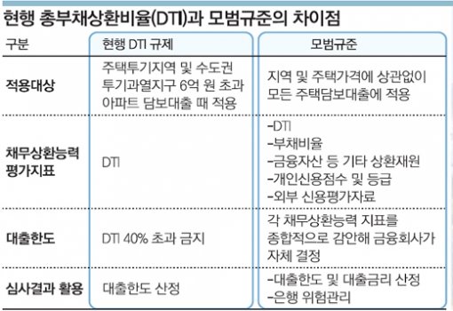 28일 시중은행과 금융감독 당국이 마련한 ‘DTI 규제와 모범규준’ 자료에 따르면 은행들은 △DTI △부채비율 △금융자산 등 상환 재원 △개인 신용점수 및 등급 △외부 신용평가자료 등 5가지 지표를 종합 분석해 주택대출을 결정하게 된다.