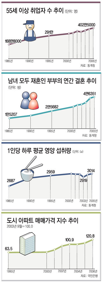 28일 통계청이 발표한 ‘2006년 한국의 사회지표’에 따르면 55세 이상 취업자는 작년 말 현재 402만5000명으로 2005년 말(385만 명)보다 4.5% 늘었다. 55세 이상 취업자가 총취업자에서 차지하는 비율도 16.8%에서 17.4%로 0.6%포인트 늘었다.