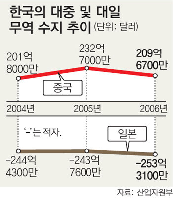 이는 대일 적자의 상당 부분을 대중(對中) 흑자로 만회해 온 한국의 동북아 무역구조에 적지 않은 변화가 나타날 수 있다는 뜻이어서 주목된다.