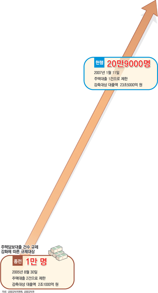 본보가 29일 입수한 ‘복수 주택담보대출에 대한 리스크 관리방안 질의응답(Q&A)’ 자료에 따르면 주택대출 건수 규제 대상자는 주택담보대출 건수를 1인당 2건으로 제한한 2005년 8·30대책 기준으로 1만 명이었으나 올해 1·11대책으로 20만9000명으로 늘었다.