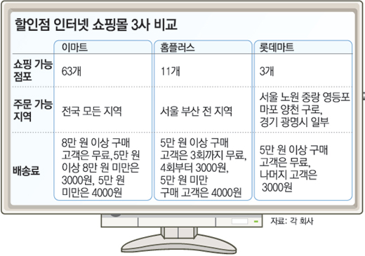대형할인점이 운영하는 인터넷쇼핑몰은 다른 일반 인터넷쇼핑몰과 근본적으로 차이가 있다. 일반 인터넷쇼핑몰은 주문이 들어오면 창고에 쌓아둔 물건을 꺼내 배송해 주는 시스템이다.