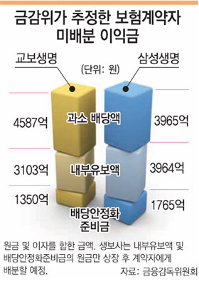 재산정해서 나온 미배당원금에 생보사 연간 자산운용수익률을 적용해 추정한 이자를 더한 결과, 교보생명은 4587억 원을 계약자에게 덜 줬고, 삼성생명은 3965억 원을 덜 배분한 것으로 집계됐다고 추정했다.