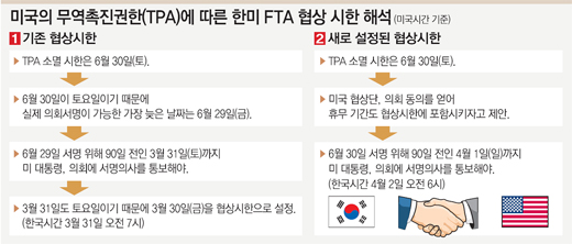 협상권을 가진 미 의회가 행정부에 부여한 무역촉진권한(TPA)에 따르면 협상 시한 만료는 미국 시간 기준으로 6월 30일. 따라서 이때 최종 협정문에 서명을 해야 하고, 이를 위해서는 90일 전인 4월 1일에 미 행정부가 의회에 협정 체결 의사를 보고해야 한다.