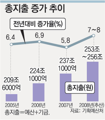 정부가 24일 국무회의에서 의결·확정한 ‘2008년도 예산안 편성 및 기금운용계획안 작성 지침’에 따르면 내년도 나라 살림(총지출=예산+기금)은 올해(237조1000억 원)보다 7∼8% 늘어난 253조∼256조 원에 이른다.