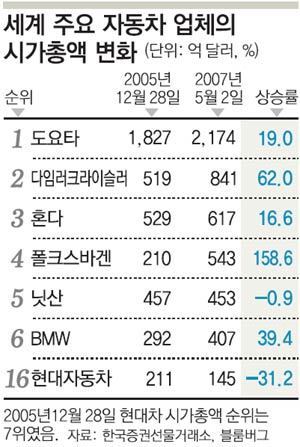 이 기간 시가총액이 감소한 회사는 현대차와 일본 닛산뿐이었지만 닛산의 시가총액 감소는 0.9%에 그쳤다.