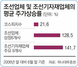 하나대투증권에 따르면 작년 말 대비 올해 6월 말 현재 상장 조선업체 6개사의 주가 상승률은 평균 128.5%인 데 반해 대표적인 조선기자재 업체 9개사는 평균 141.7%로 상승폭이 더 컸다.