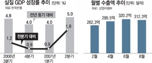 한국은행이 3일 내놓은 ‘2007년 2분기 국민소득’(잠정)에 따르면 2분기 실질 GDP는 전분기에 비해 1.8% 성장해 2003년 4분기(10∼12월)의 2.7% 이후 가장 높았다. 지난해 같은 기간보다는 5.0% 성장했다.