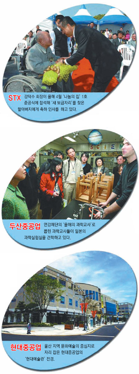 삼성중공업과 대우조선해양도 자체 경제적 지원뿐만 아니라 소외된 이웃과 함께하는 ‘체험 봉사활동’을 직원들에게 권장하고 있다. 사내 봉사활동 단체를 특화해 실속 있는 도움을 준다는 것이 이들 회사 관계자의 설명이다.