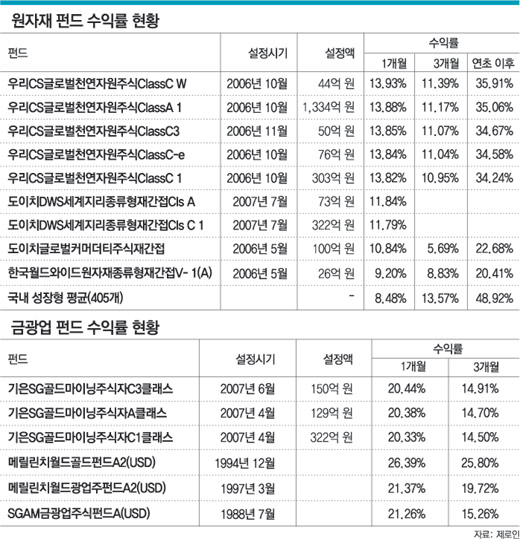 4일 펀드평가사 제로 인에 따르면 최근 1개월간 우리CS자산운용, 한국투신운용, 도이치자산운용 등이 운용하는 원자재 펀드의 수익률은 9.20∼13.93%다. 같은 기간 국내 주식형 펀드의 평균 수익률(8.48%)보다 높다.