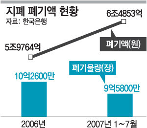 한국은행이 7일 국회 재정경제위원회 최경환(한나라당) 의원에게 제출한 자료에 따르면 올해 들어 7월까지 폐기된 지폐 금액은 총 6조4853억 원으로 조사됐다. 이는 작년 한해 폐기액 5조9764억 원을 넘어서는 규모다.