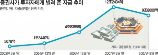 금융감독원이 7일 국회 정무위원회 소속 진수희(한나라당) 의원에게 제출한 ‘증권 대출 현황’ 자료에 따르면 9월 말 현재 국내 증권사들이 신용융자, 유가증권매입자금대출, 예탁증권담보대출 명목으로 투자자들에게 빌려 준 신용공여 금액은 총 9조8000억 원으로 집계됐다. 이는 현 정권 출범 직후인 2003년 3월 말(5078억 원)의 19.3배로 늘어난 것이다.