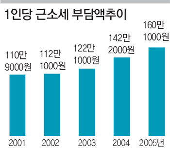이에 따라 징수액을 납세자로 나눈 1인당 근소세 부담액은 160만1000원으로 5년 전인 2000년(102만4000원)에 비해 56.4% 증가했다.