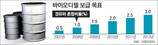 정부는 지난달 경유를 대체하는 바이오디젤의 중장기 보급 계획을 내놓는 한편 국내에서 원료를 조달하기 위해 바이오디젤용 유채꽃 생산 사업에도 나섰다. 기업들도 해외 플랜테이션을 통해 바이오에너지 원료를 확보하는 사업에 착수했다.