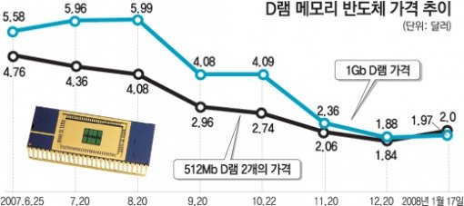 온라인 반도체 중개사이트인 디램익스체인지는 17일 반도체 현물거래시장에서 DDR2 D램 1Gb 제품이 평균 1.97달러에 거래돼 같은 용량인 512Mb 제품 2개 가격인 2달러보다 낮았다고 18일 밝혔다. 마감 가격 기준으로 처음 가격 역전이 나타난 셈이다.