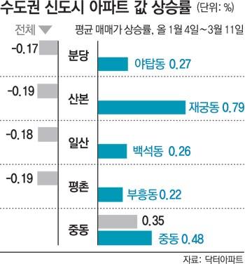 14일 부동산 정보업체인 닥터아파트에 따르면 1월 4일부터 이달 11일까지 신도시 5곳 가운데 산본(―0.19%), 평촌(―0.19%), 일산(―0.18%), 분당(―0.17%) 등 4곳의 아파트 값이 내렸다. 중동만 0.35% 올랐다.