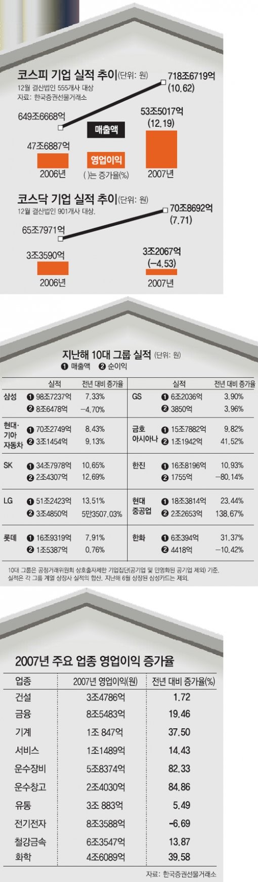 이들 기업의 지난해 영업이익은 53조5017억 원으로 전년 대비 12.19% 늘었다. 2005년 ―9.8%, 2006년 ―7.8% 등 2년 연속 감소하던 전년대비 영업이익이 증가세로 돌아선 것.