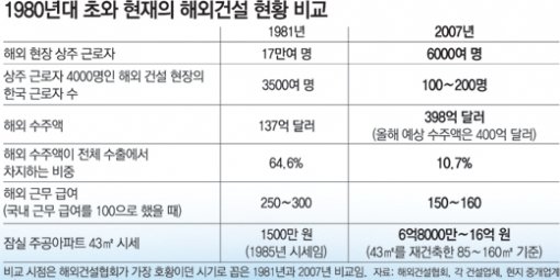 1981∼1983년 당시 해외 현장에 상주하던 한국 인력은 17만여 명이었다. 지금은 사상 최대 호황이지만 해외 현장의 한국 인력은 고작 6000명 남짓이다.