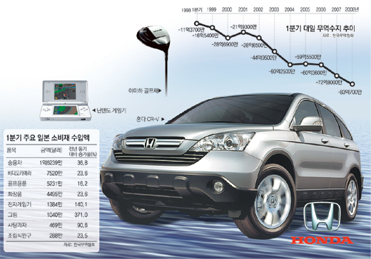 1분기 대일 무역수지 적자는 83억700만 달러(약 8조2239억 원)로 지난해 같은 기간 72억8000만 달러에 비해 11.4%나 늘었다. 이는 10년 전인 1998년의 11억3700만 달러의 약 7배에 달하는 금액이다.