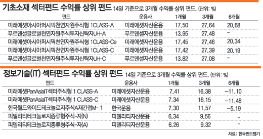 15일 한국펀드평가에 따르면 14일 기준으로 전체 섹터 주식펀드의 최근 3개월 평균 수익률은 8.12%. 이에 비해 같은 기간 기초소재섹터 펀드는 16.47%, IT섹터 펀드는 16.29%로 상대적으로 높은 수익률을 보였다.