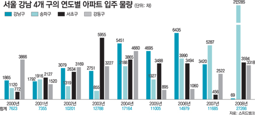 강남구는 올해 전체 입주물량이 69채에 불과해 2000년대 들어서 입주물량이 가장 적다. 하지만 인근 송파구와 서초구의 대규모 입주물량에 직접적인 영향을 받아 아파트 가격이 하락세다.