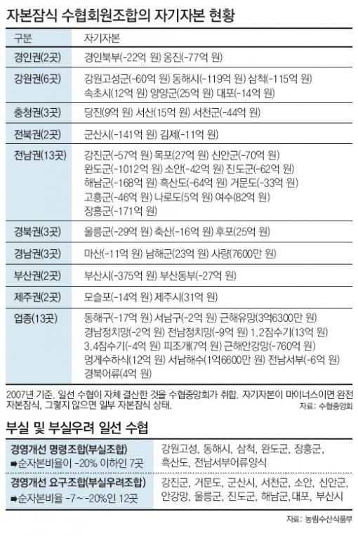 동아일보 산업부가 1일 입수한 수협중앙회의 ‘수협회원조합 자기자본현황’에 따르면 일선 수협 문제가 가장 심각한 시도는 전남과 부산인 것으로 나타났다.